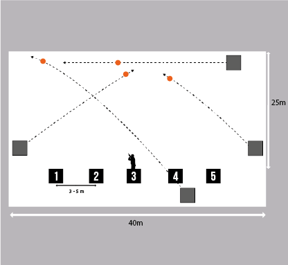 De duiven moeten te schieten zijn binnen deze rechthoek. Werpen en landen van de duiven kan echter ook buiten de rechthoek plaats vinden. Verdere voorwaarden zijn dat er minimaal 6 machines opgesteld zijn en dat de aangeboden variatie aan duiven groot is.